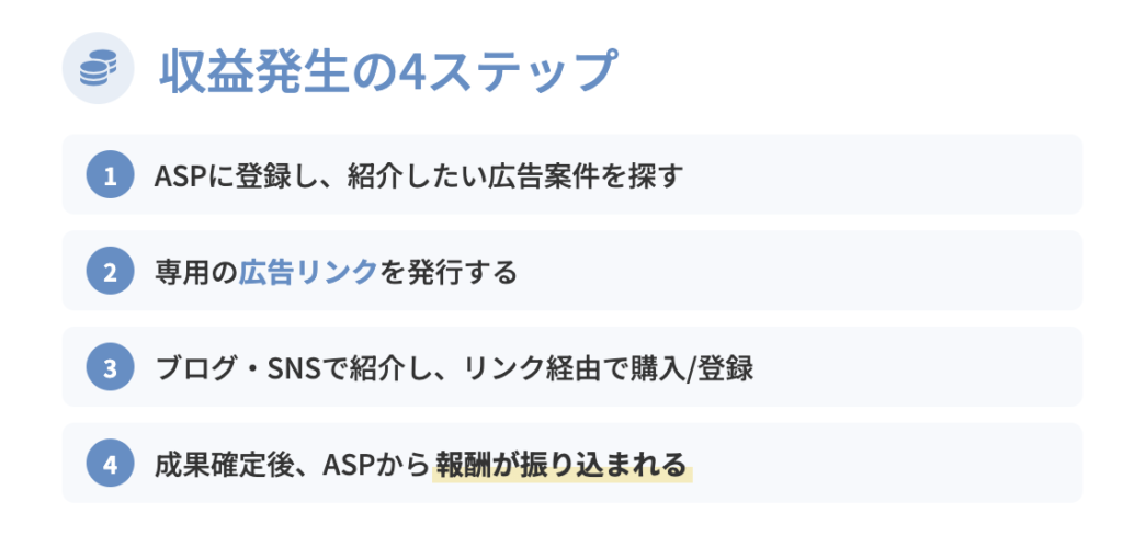 このような流れで、ASPから自分に紹介料が振り込まれます。