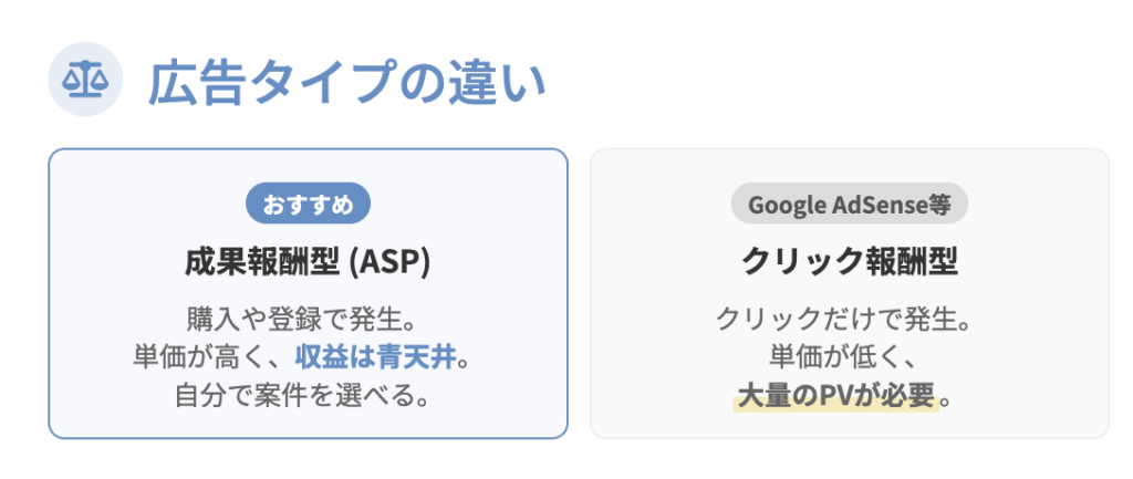 そしてブログで収益化をする方法としては、成果報酬型広告とクリック型広告の違いについても簡単に理解しておきましょう。