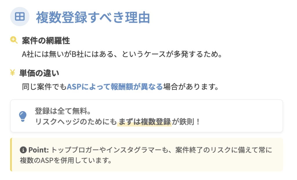 このように、ASPに複数登録していた方が圧倒的にお得だからですね。