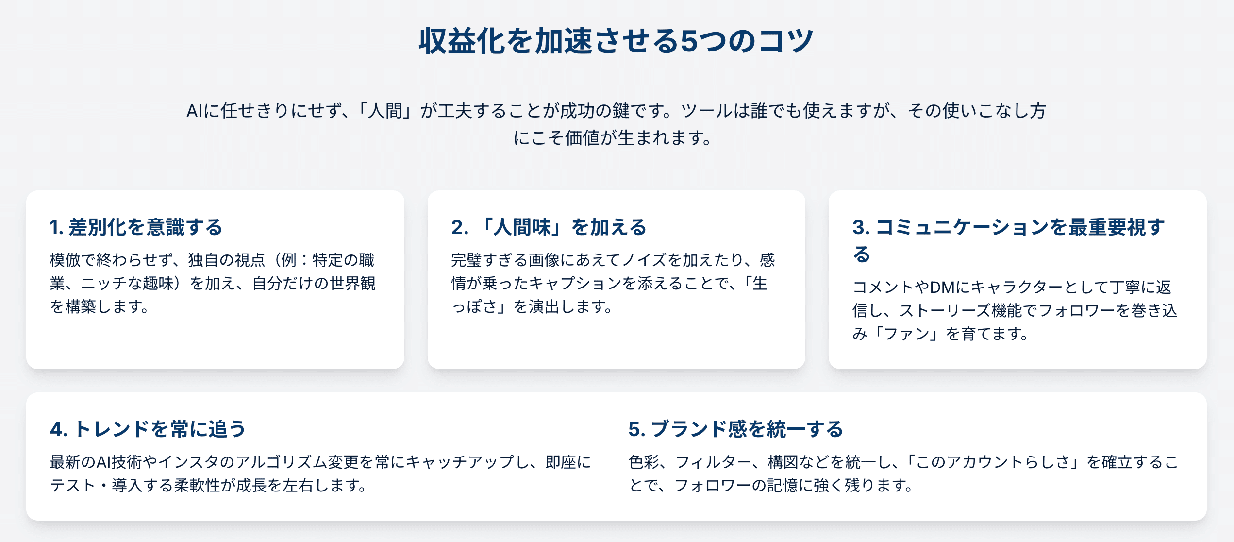 この「ストーリー性」こそが、他の無個性なAIアカウントとの決定的な差別化ポイントとなり、フォロワーとの間に強固な絆(エンゲージメント)を築く鍵となります。