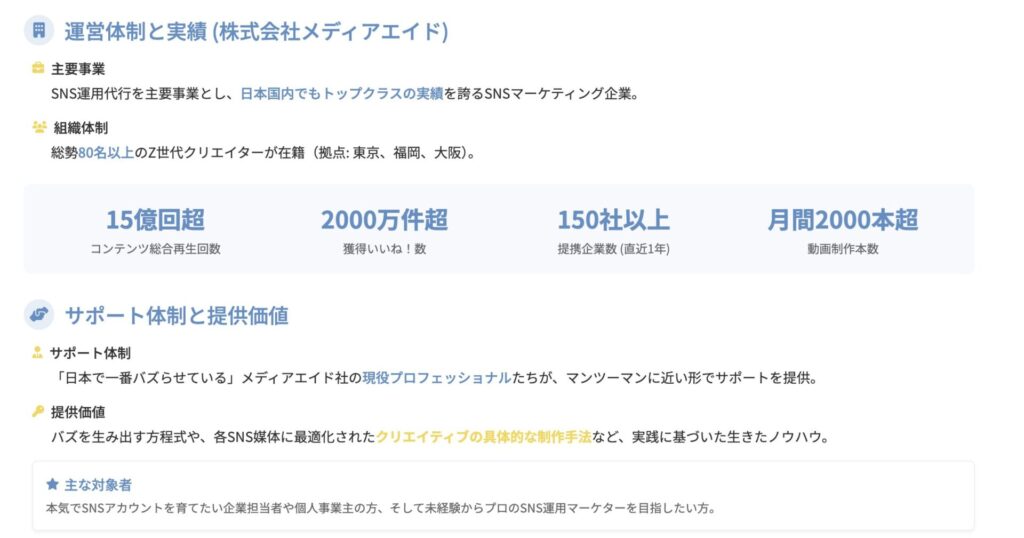 このメディアエイド社は、SNS運用代行を主要事業とし、日本国内でもトップクラスの実績を誇るSNSマーケティング企業です。