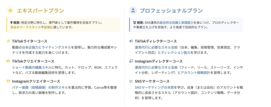 一方、プロフェッショナルプランは、個別のスキルだけでなく、SNS運用に関する総合的な知識と実践能力を身につけ、プロのSNS運用ディレクターとして、あるいは自身でSNS運用事業を立ち上げて活躍したい方のための、より高度で包括的なプランです。
