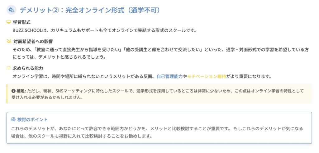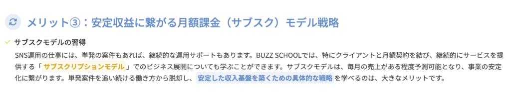 実際にBUZZ SCHOOLの口コミを調べてみると、「SNS運用の基礎から応用まで体系的に学べる」や「実践的なカリキュラムで、実際に案件獲得に繋がった」といった肯定的な評価が見られます。