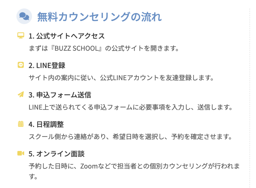 もし、BUZZ SCHOOLの内容に少しでも興味を持たれたのであれば、まずは気軽に無料カウンセリングに参加してみることを強くお勧めします。