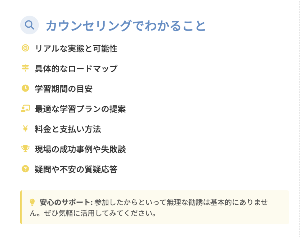 そのため、まずは無料カウンセリングを通じて、スクールの内容や雰囲気を深く理解し、自分に本当に合っているかどうかを納得した上で、料金を含めて総合的に判断してほしい、という意図があるのです。