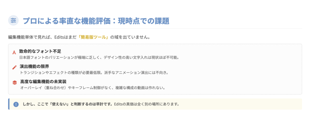 既存の編集アプリに慣れ親しんでいる人ほど、**「あれ、これしかできないの?」**という物足りなさを感じる瞬間があるはずです。