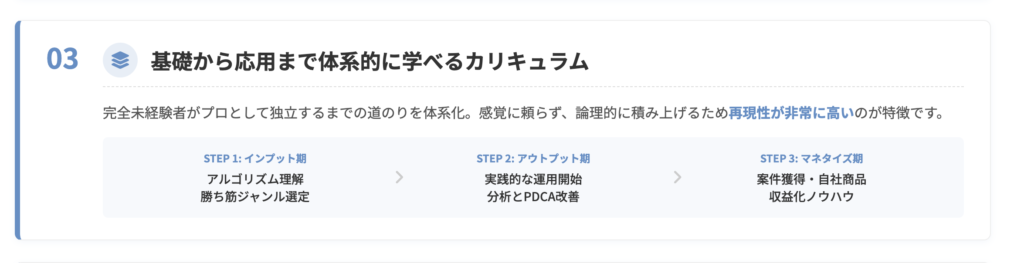 感覚に頼るのではなく、論理的に積み上げていくカリキュラムなので、再現性が非常に高いのが特徴です。