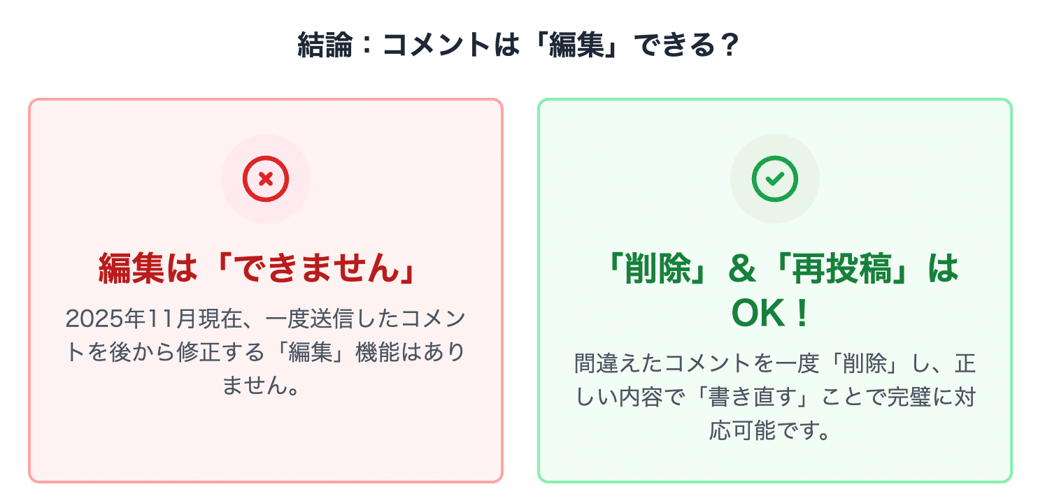 修正が必要な場合は、例外なく、そのコメントを一度「削除」し、改めて「新しいコメントとして投稿し直す」という手順を踏む必要があります