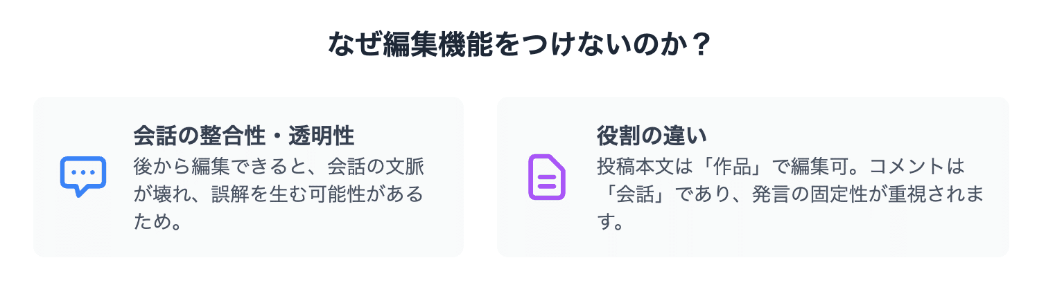 「作品(本文)」は発信者が完成度を高めるために編集できるべきですが、「会話(コメント)」は参加者全員の信頼関係の上で成り立つため、後からの改変が厳しく制限されているのです