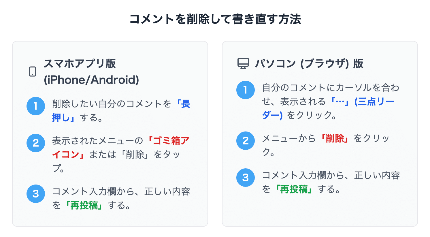 ここからは、コメントを「削除」し、「書き直す」ための最も確実で具体的な手順を、スマホアプリ版とパソコン版に分けて詳しく解説します