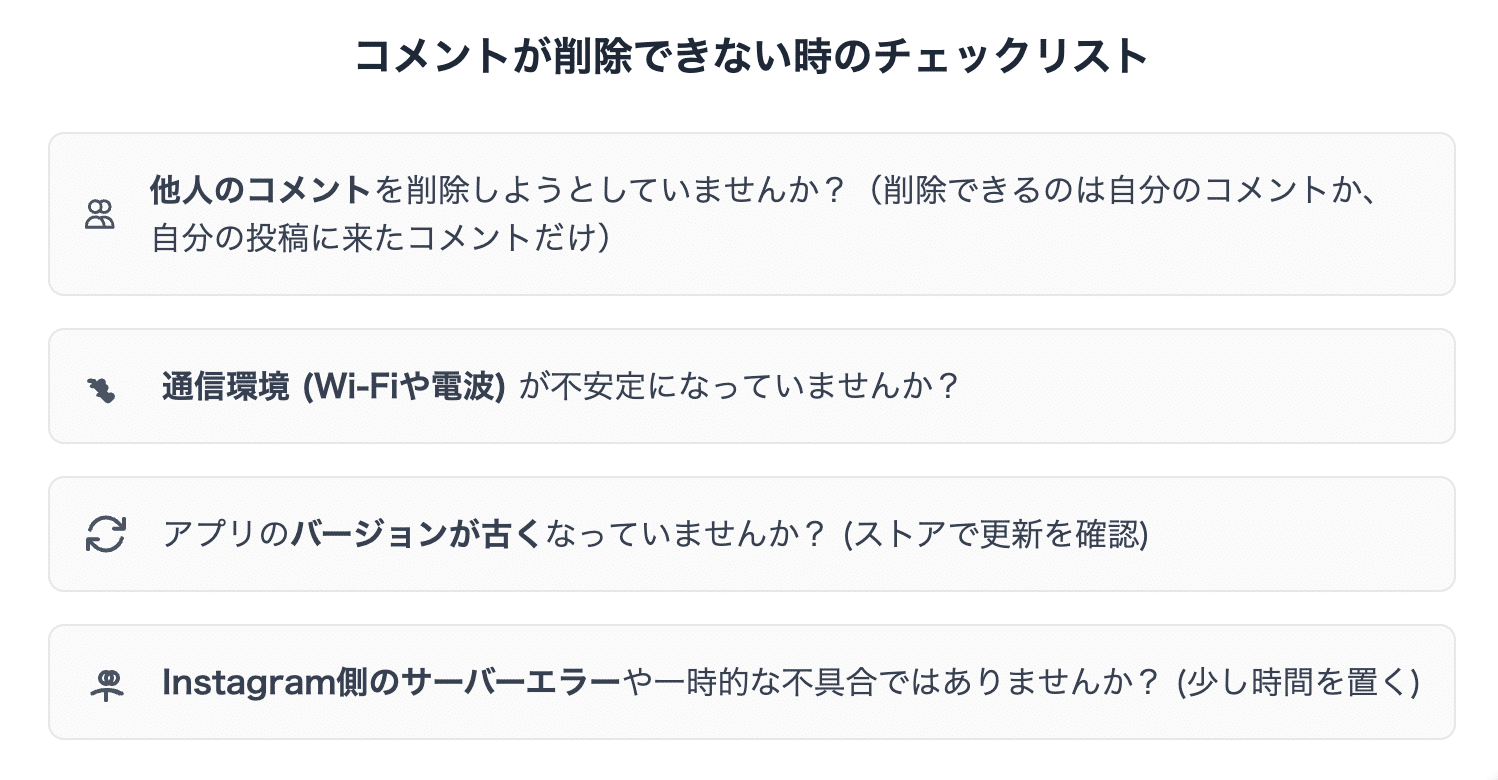 (iOSのバージョンや設定によっては、コメントを「左にスワイプ」することでも削除オプションが表示される場合がありますが、長押しが最も確実な方法です)