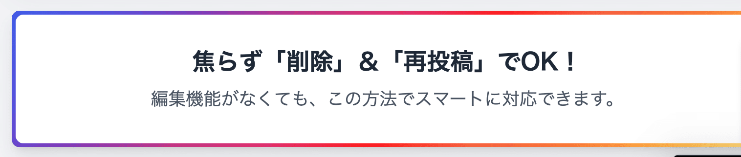 「編集」はできなくとも、「削除」して「書き直す(再投稿する)」という方法で、完璧に対応することが可能だからです