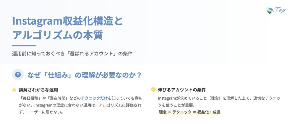 この章では、なぜ毎日投稿や滞在時間が大切なのかを、Instagramのアルゴリズムや収益化構造と絡めながら解説します。