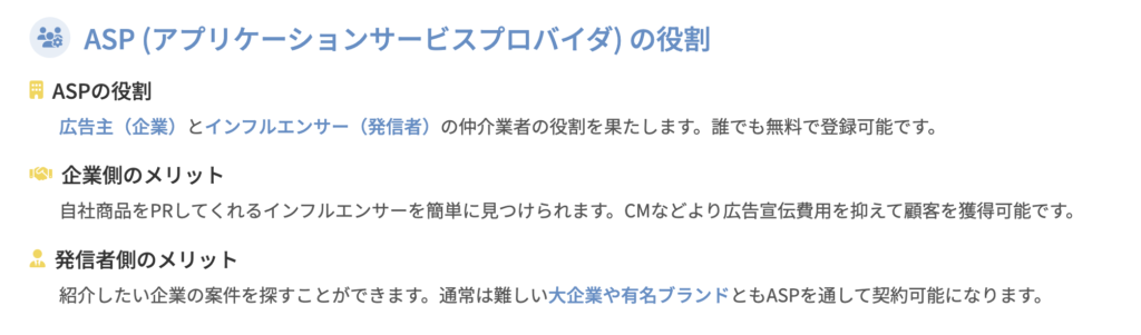 逆に発信者・インフルエンサー側からは企業と直接つながることは一般的には簡単にできませんが、ASPを使うことで自分が紹介したいと思えるような企業の案件を探すことができます。