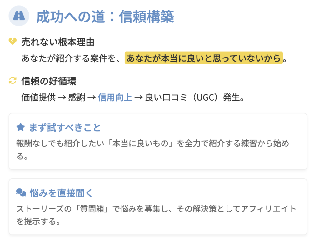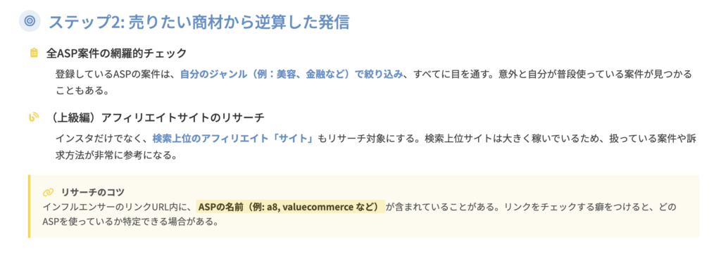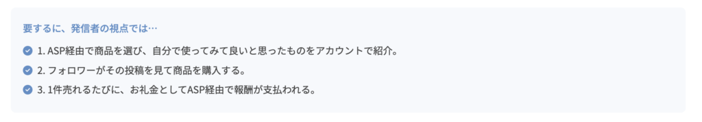 少し難しい言葉をたくさん使いましたが、要するに1つ目ASPを経由して商品を自分で使ってみていいと思ったものをアカウントで紹介する。