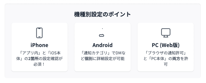 アプリ内の設定と、デバイス本体(OS)の通知設定の両方が正しく連携して初めて、通知は正常に機能します。