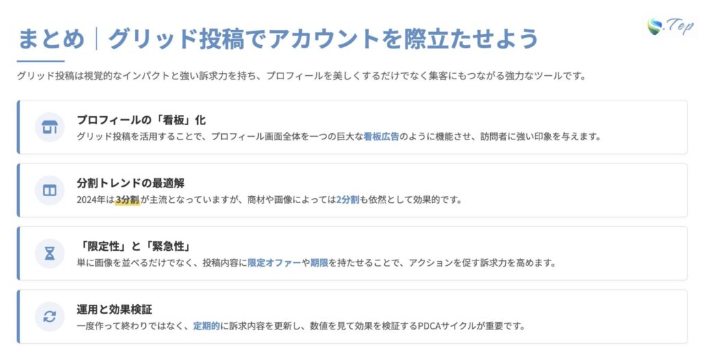 グリッド投稿は、訪れたユーザーに「このアカウントが何を伝えたいのか?」を一瞬で理解させる強力なツールです。