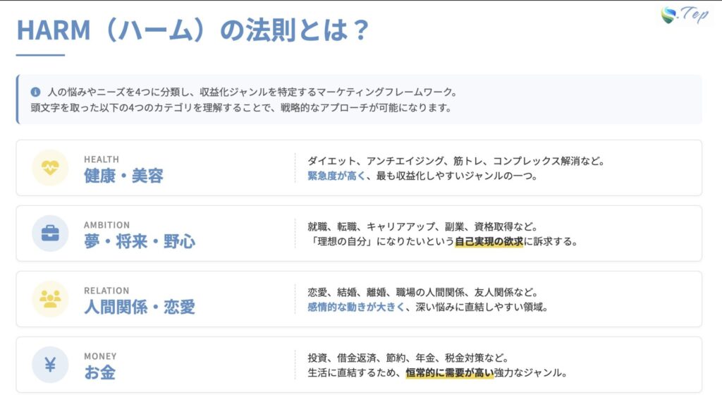 HARM(ハーム)の法則は、マーケティングの世界で広く知られているフレームワークで、人々の悩みやニーズを4つの主要カテゴリに分類するものです。