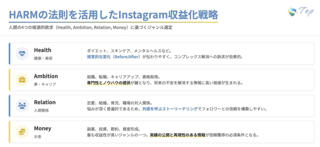 そこで、HARMの法則に基づき、収益化に適したジャンルとその特徴について詳しく解説し、それぞれのメリット・デメリットも考察します。