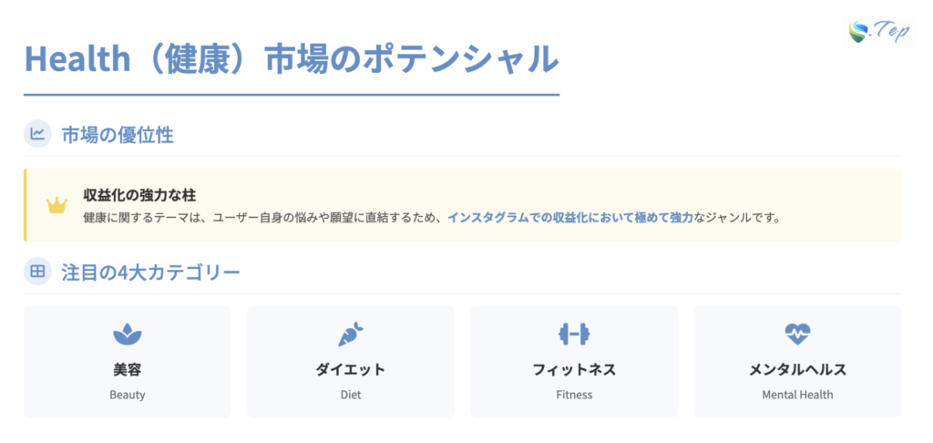 健康に関するテーマは、特にインスタグラムでの収益化において非常に強力です。