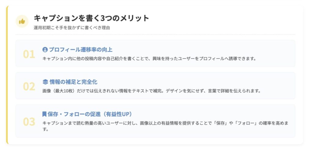 このように、キャプションを書くことで、たくさんのメリットがあります。