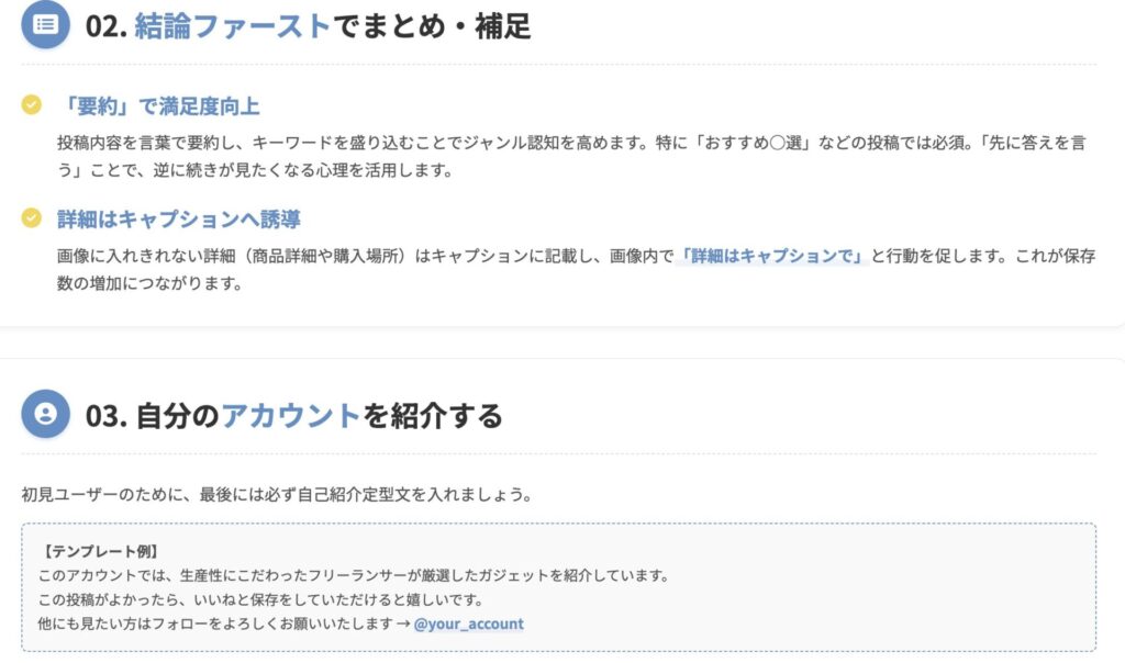 その人たちに向けて、画像に書いていないもっと有益な情報を入れることで、保存してもらったり、フォローしてもらったりする可能性が高まります。