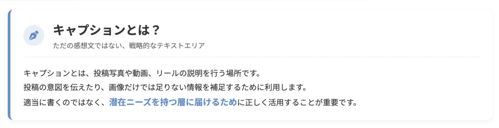 キャプションは、投稿の内容は意図を伝えたり、投稿の足りない部分を補ったりするために利用します。