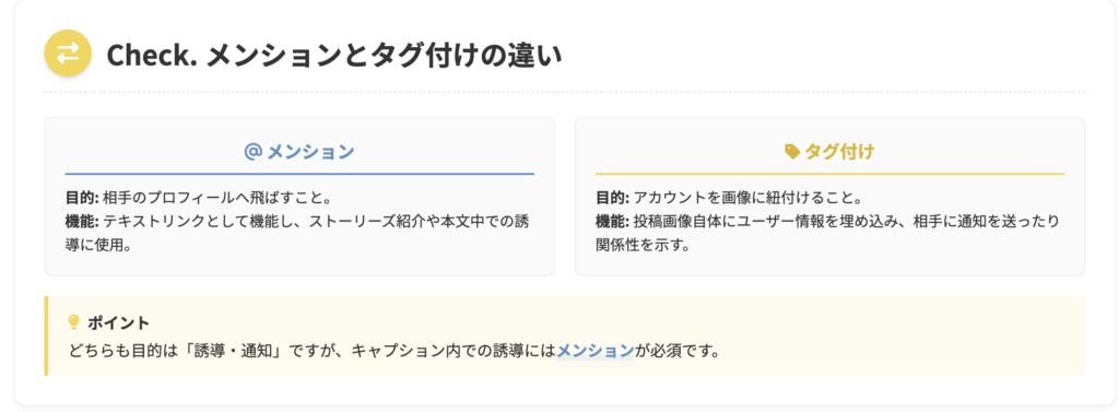 メンションは相手に飛ばすこと、タグ付けはアカウントを紐づけることと覚えておきましょう。