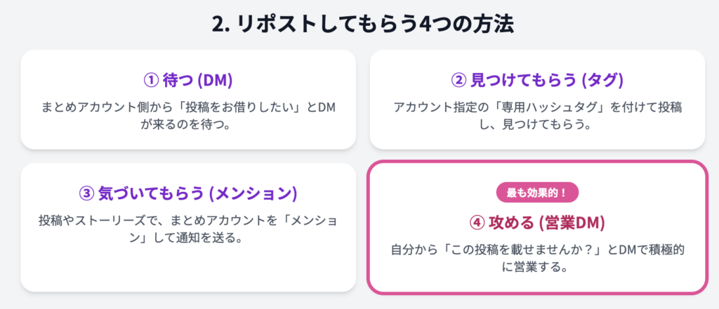 まとめアカウントにリポストしてもらうには4つの方法があります。