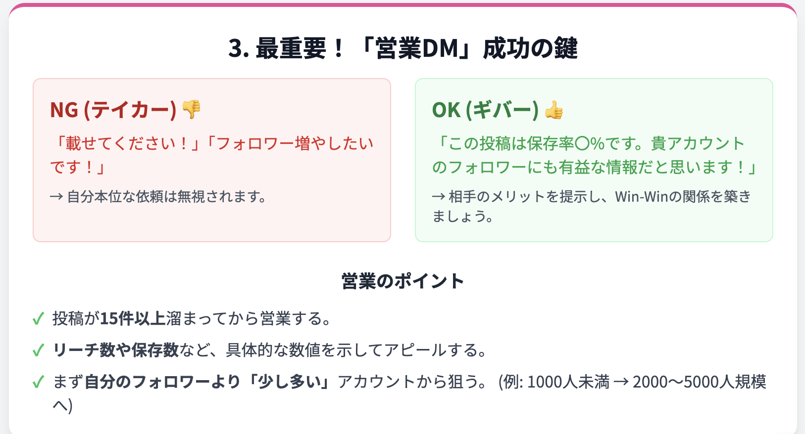 そのため、自分の投稿が多くの人にリーチしていればその投稿をリポストして欲しいと直接DMが来る流れですね。