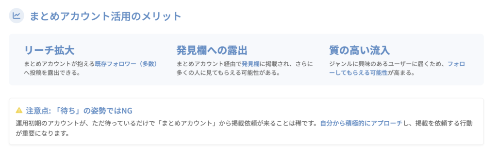 まとめアカウントをきっかけに自分のアカウントをフォローしてもらえる可能性も高く、運用初期は特に積極的に活用していくのがおすすめです。