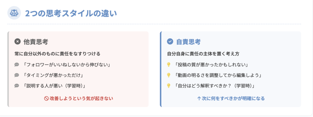 一方自責思考が他責思考の対義語にあって、まずは自分自身に責任の主体を置く考え方です。