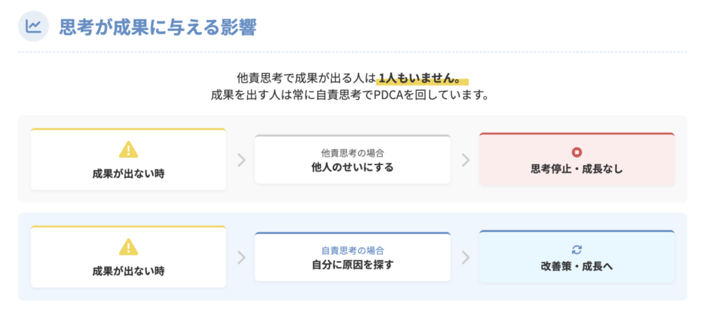 このような自責思考の考え方を持てる人と持てない人だったら当然のように成長のスピードが変わってきます。