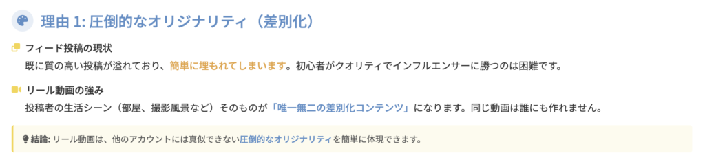 しかしリール動画なら、投稿作成者の生活シーンそのものが「差別化コンテンツ」です。