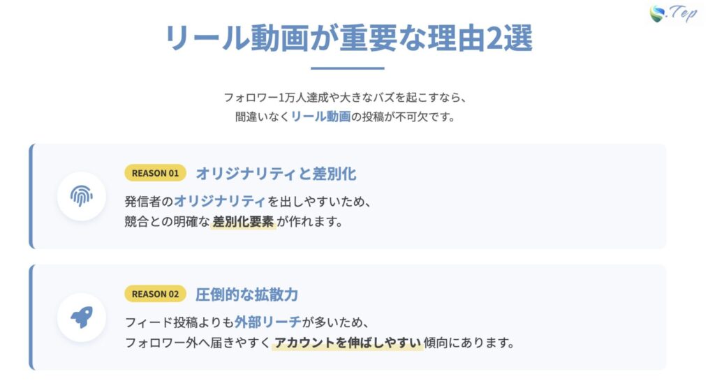 リールが重要な理由の1つ目は、「差別化しやすい」から。