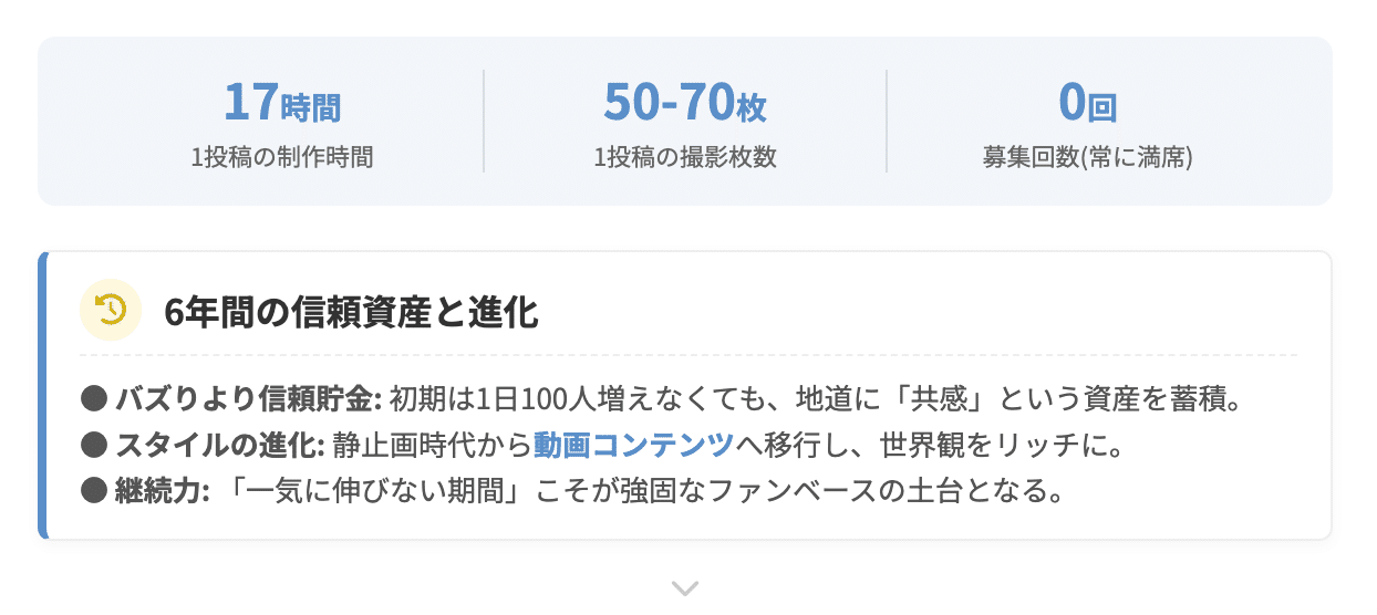 かつては静止画が主流でしたが、時代の変化に合わせて動画コンテンツに挑戦し、自分の世界観をよりリッチな情報量で届けることで、既存フォロワーの熱量を高めました。
