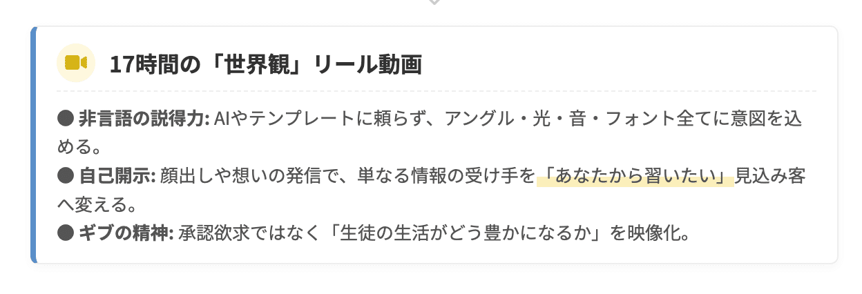 自分本位な「見て見て」という承認欲求ではなく、「これを見ることで、生徒さんの生活がどう豊かになるか」というギブの精神が映像の細部に宿ります。