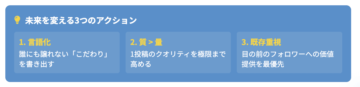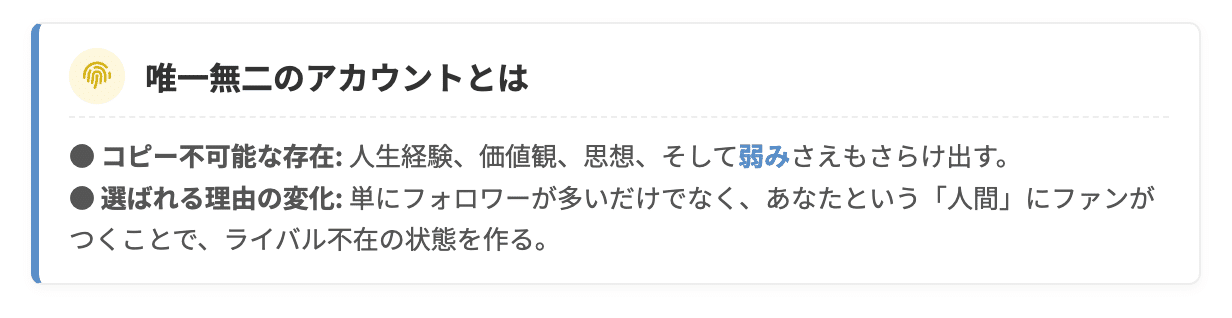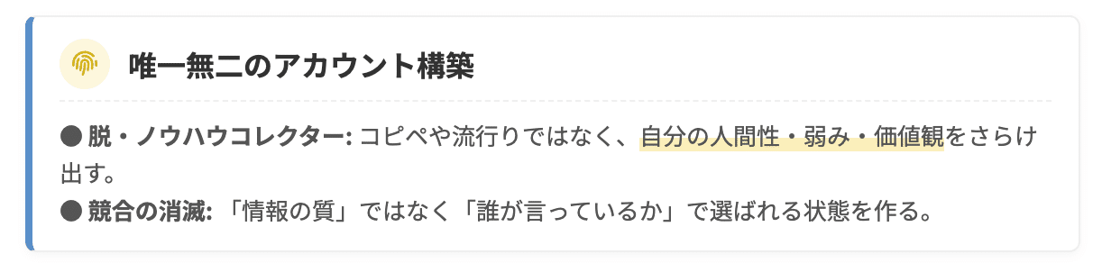 「唯一無二のアカウント」とは、あなたの人生経験、価値観、思想、そして弱みさえもさらけ出した、コピー不可能な存在になることです。