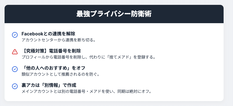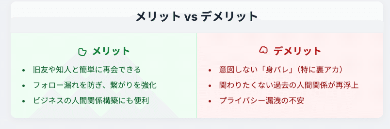 もちろん、表向きの理由は「あなたが知り合いを見つけやすくするため」とされていますが、その裏にはこうしたプラットフォーム側の明確な戦略が存在することを理解しておく必要があります。