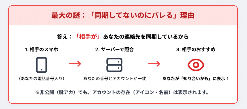 つまり、連絡先同期は、あなた自身が知人を見つけると同時に、あなた自身が知人に見つかるリスクを飛躍的に高める機能なのです。
