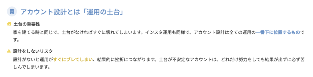 それと同じようにインスタというところの中でアカウント設計は全ての運用の土台一番下に位置するものということです。