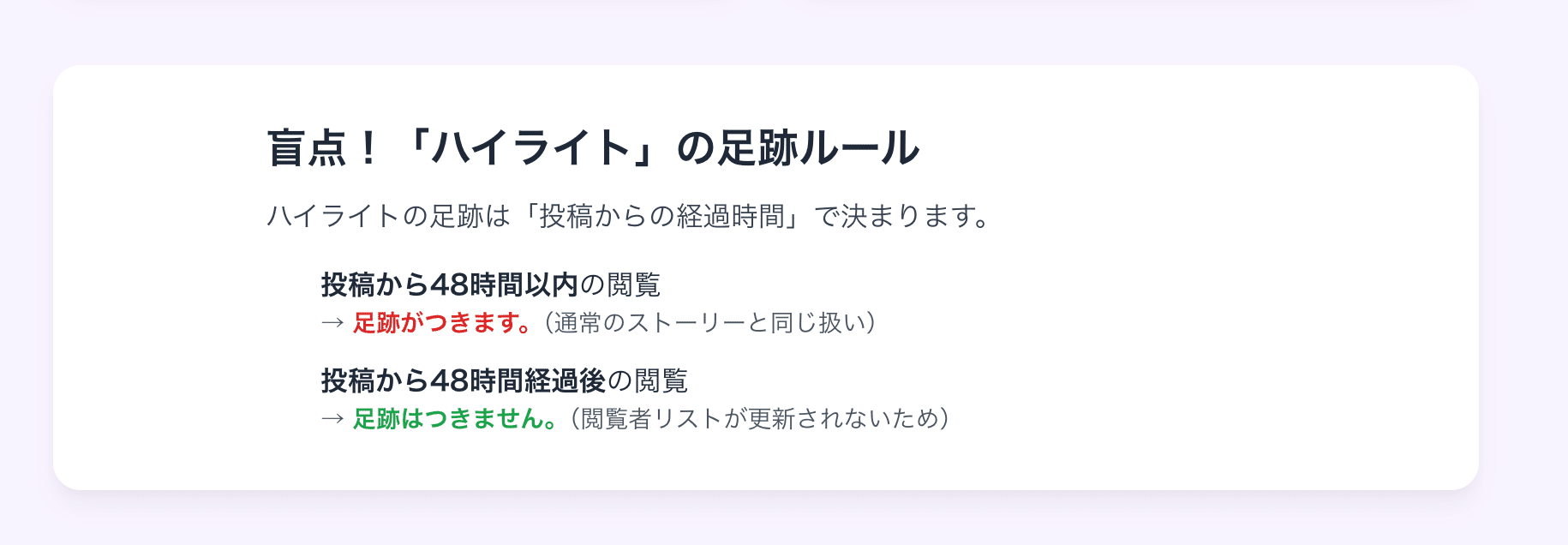 しかし、アーカイブされたストーリーでは、投稿内容(動画や写真)は見られても、24時間が経過した時点で「閲覧者リスト(足跡)」は表示されなくなります。