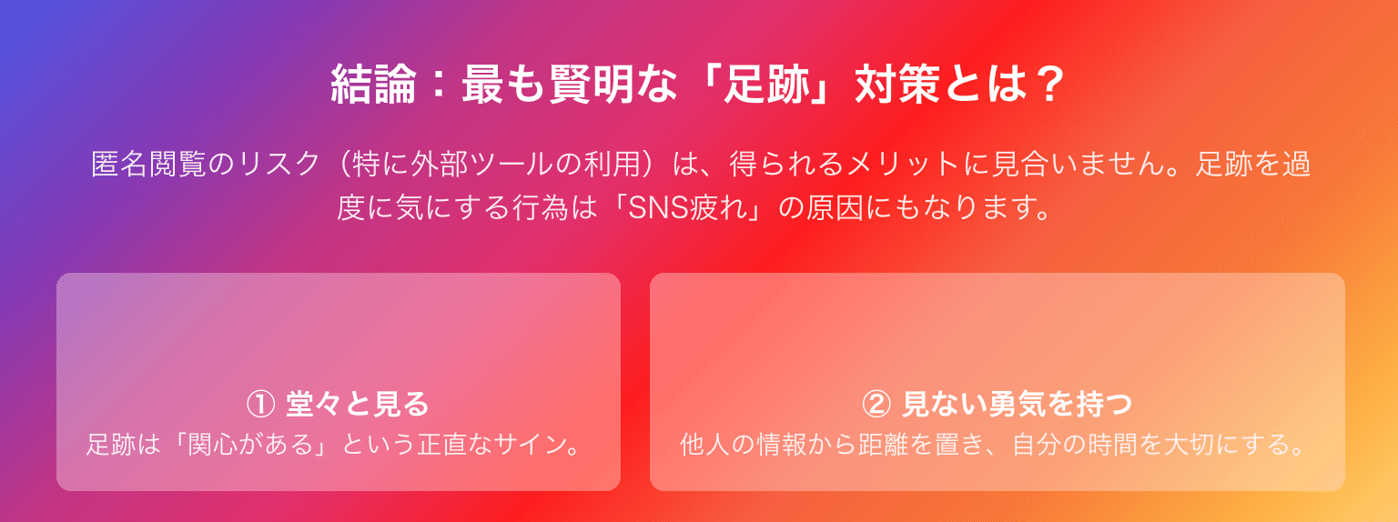 この記事を最後まで読めば、あなたはインスタストーリーの「足跡」機能に振り回されることなく、自分に合った適切な距離感で情報を取捨選択し、SNSをより賢く、安全に楽しむためのリテラシーを身につけられることでしょう。