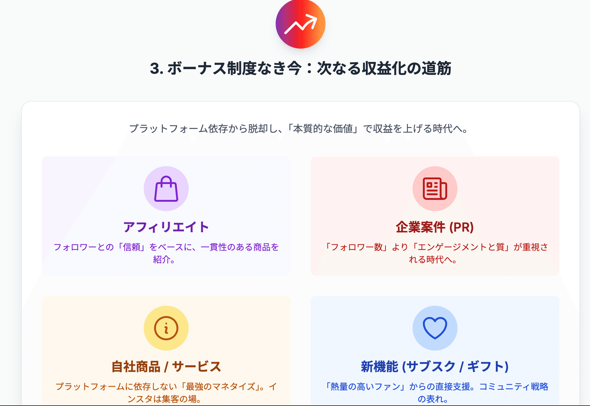 そのための最も強力な「撒き餌」こそが、クリエイターへの直接的な報酬、すなわちボーナス制度だったというわけです。