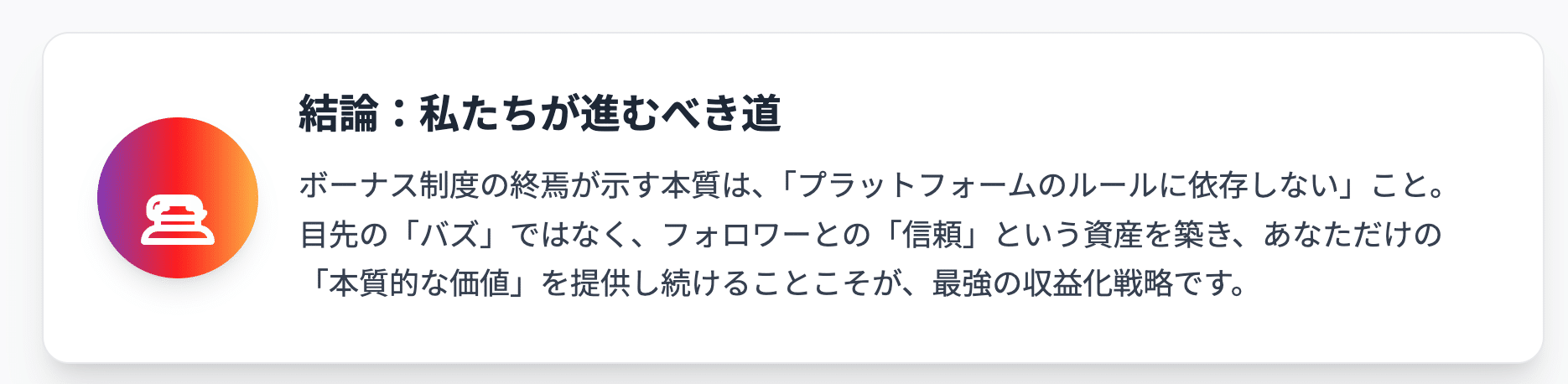 あなたがもし、インスタでの収益化に本気で取り組みたいと考えているのなら、あるいはボーナス制度という過ぎ去った(あるいは、そう言われている)機会に何らかの未練や疑問を感じているのなら、この記事は必ずやあなたの進むべき道を照らすヒントとなるでしょう。
