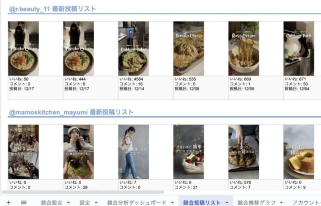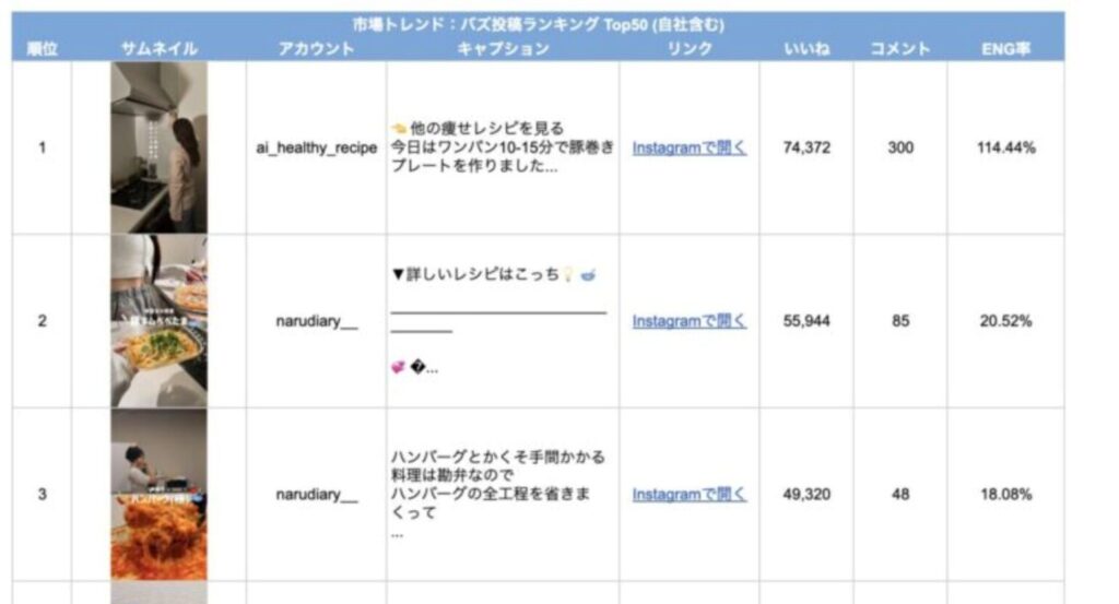 実際の競合でバズっている投稿のランキング、さらにフォロワー数から直近の投稿データまで全て丸裸に。