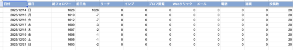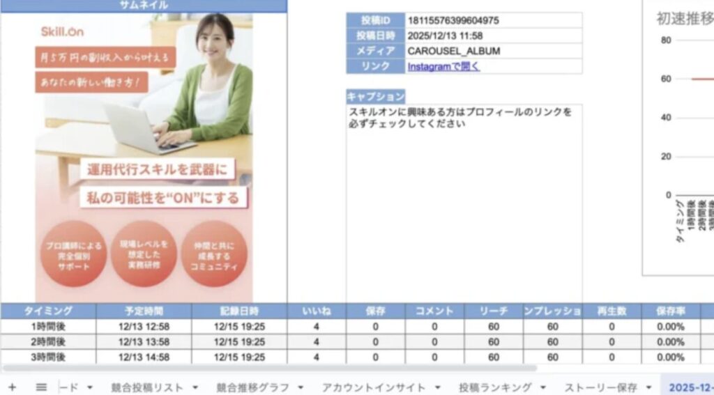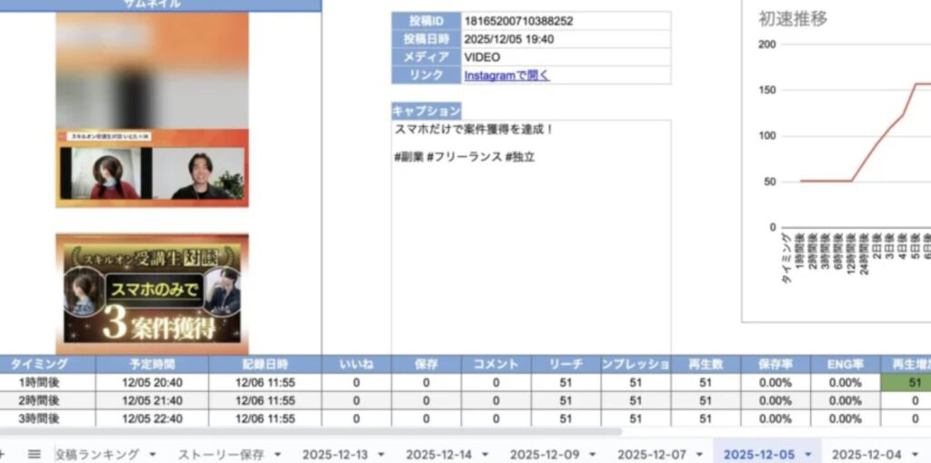 投稿を行ってから1時間後、3時間後、6時間後、12時間後、24時間後そして1ヶ月後までの数値を、全自動でスプレッドシートに記録し続けます。