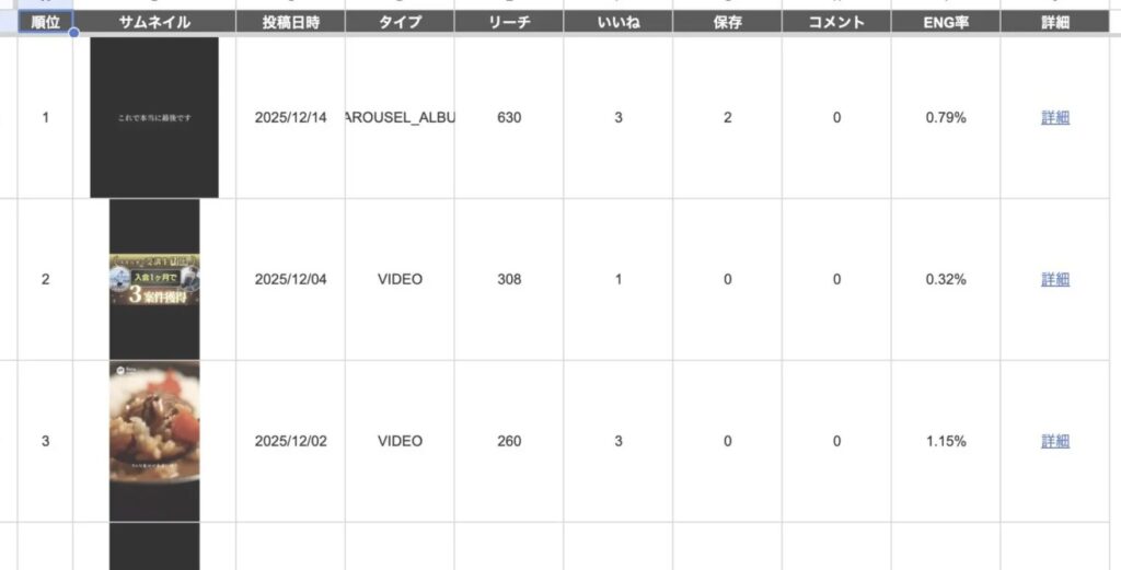 - リール投稿: リーチ、再生数、平均視聴時間、保存率、ENG率