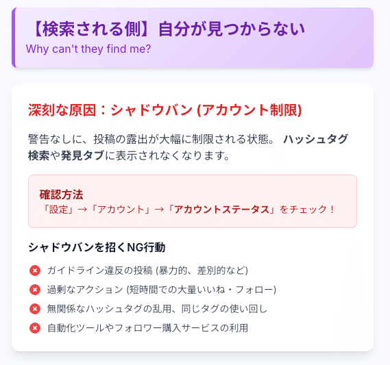 一方で、「検索される側」、つまり自分のアカウントが検索結果に表示されない時の心境は、さらに複雑で深刻なものがあり得ます。