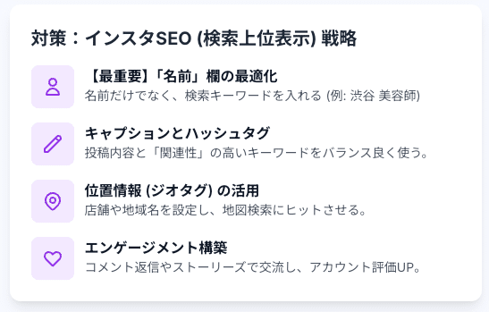 さらに、自分のアカウントを検索結果に表示させ、認知を拡大していきたいと考えるクリエイターやビジネスオーナーの皆様のために、最新の「インスタSEO対策」まで網羅的にご紹介しましょう。